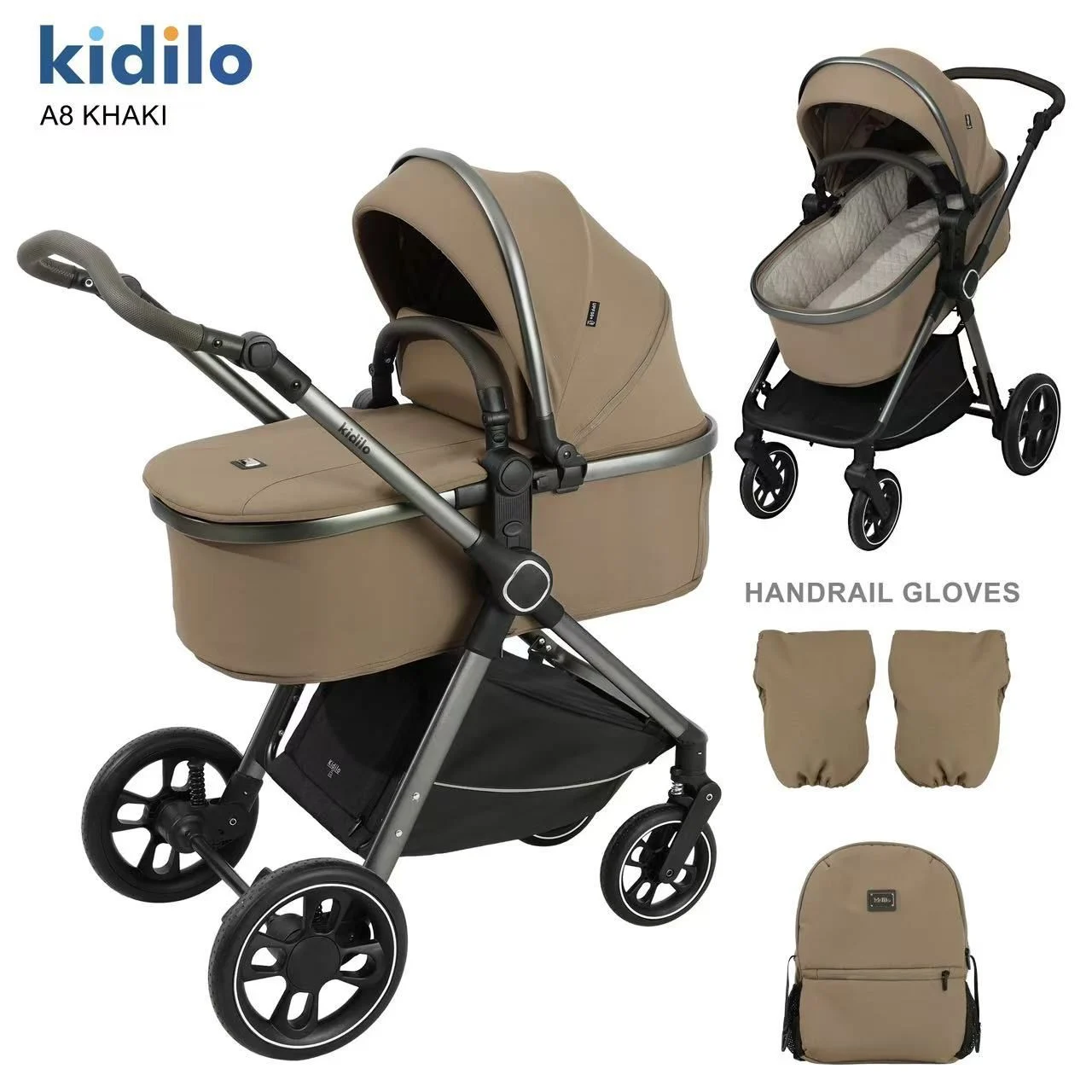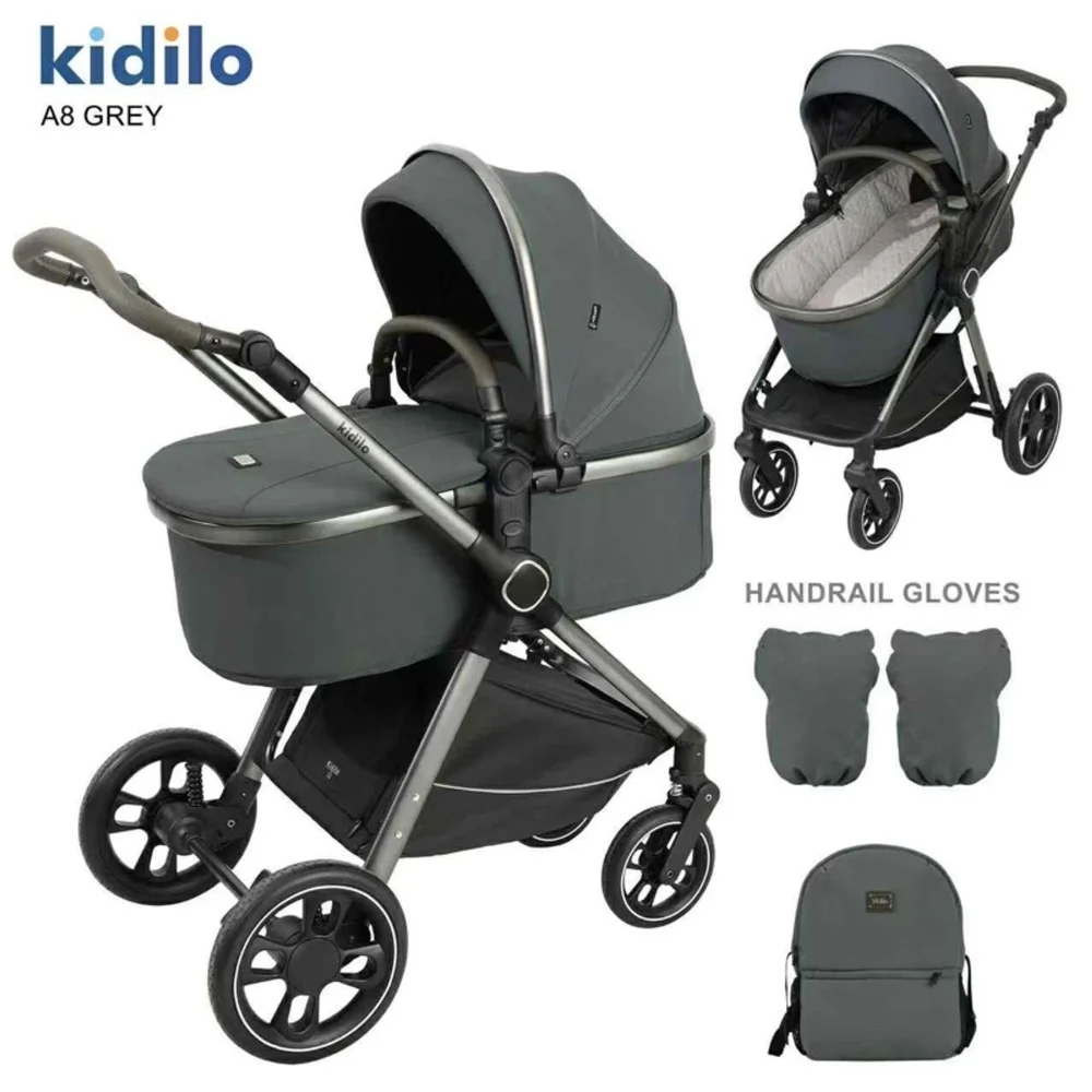 Pack Poussette A8+C Pour Bebe – Kidilo comprend tous les éléments nécessaires pour prendre soin de votre enfant dès la naissance. Il comprend une poussette, siège auto, couvre-pieds, habillage pluie, moustiquaire, sac à dos pour maman, gants de main courante et matelas.
